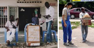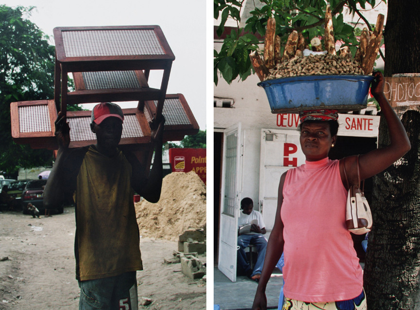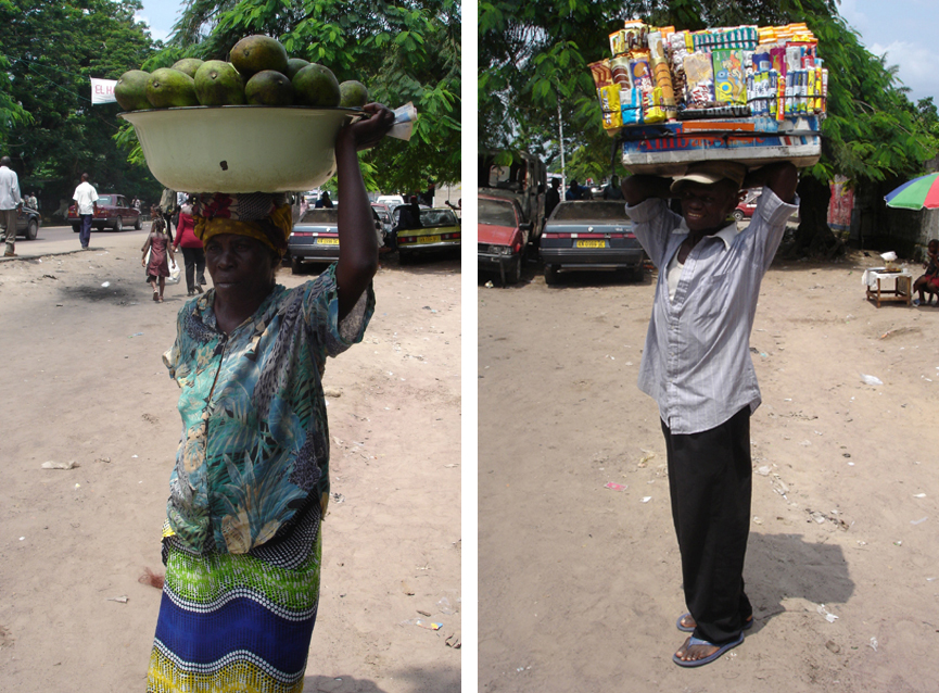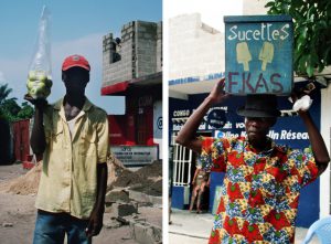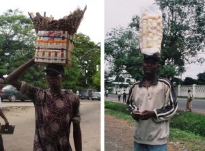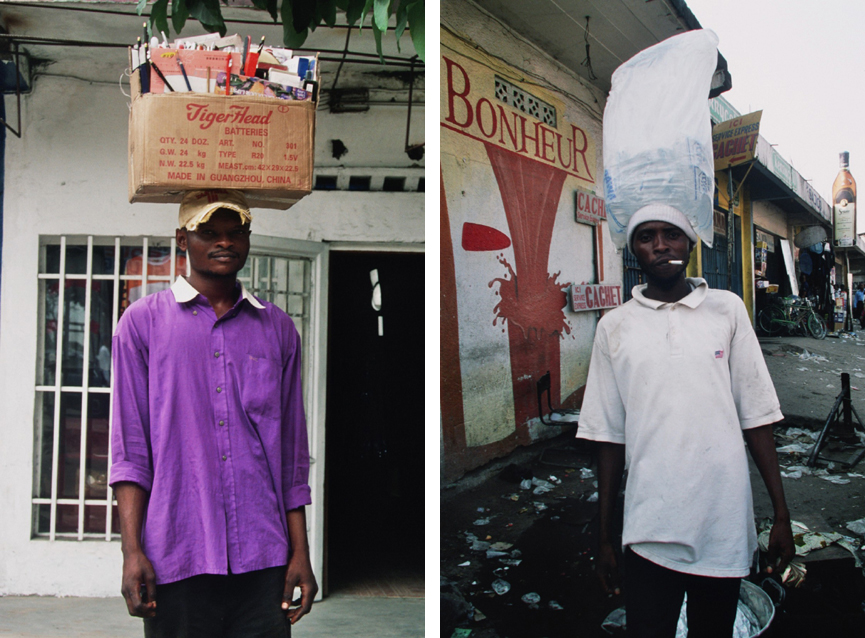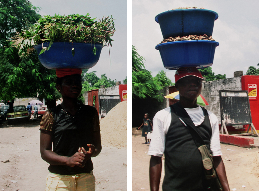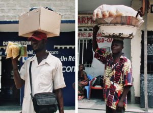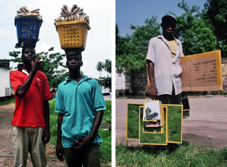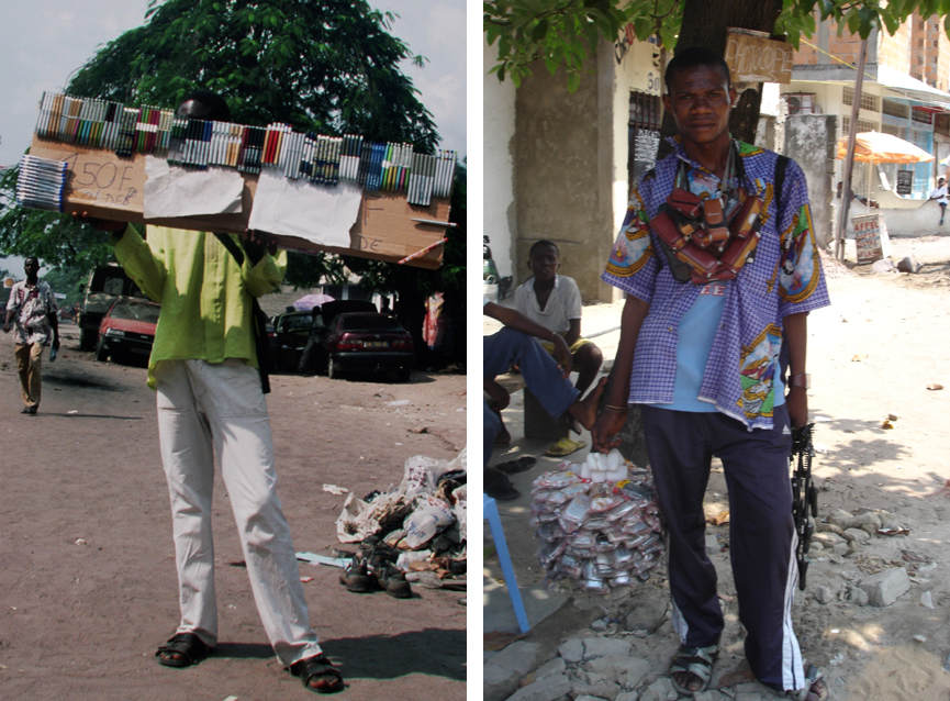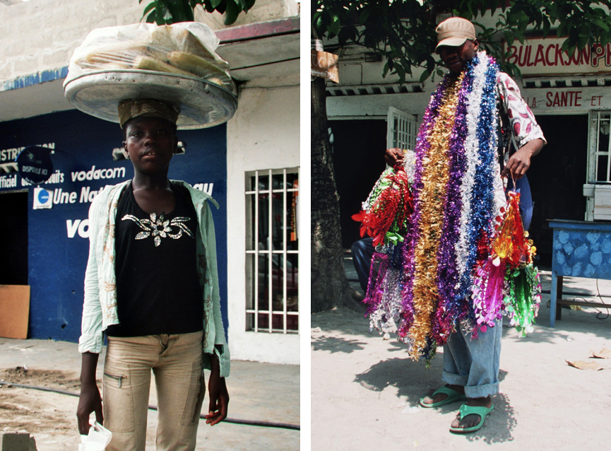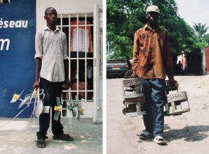 « Ayant compris que c’était compliqué de faire des photos à kinshasa, je me suis installée le 22 décembre de 10 h à 16 h un stand en face de l’Académie afin de photographier les « éfés » (vendeurs ambulants). Parole et négociation pour chacune des 40 diapositives qui n’ont finalement pas pu être développées sur place »