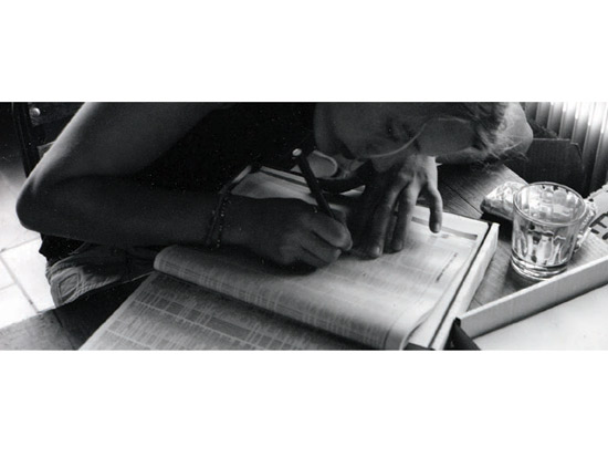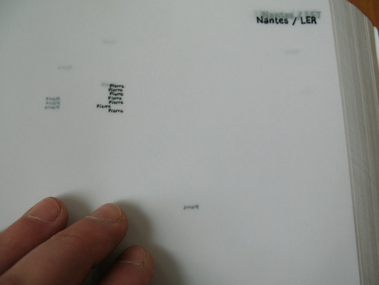 Considérant d’abord l’annuaire et les pages jaunes comme outil indispensable (1) au même titre qu’un dictionnaire et sachant que l’annuaire fut utilisé par des mathématiciens en quête de suites de nombres aléatoires (2), je me suis approché de cet objet de plus près et de son contenu. J’ai extrait tous les Pierre (prénom homonyme du synonyme de « gros cailloux » (sur lequel on trébuche pour avancer à grand pas)) pour obtenir une disposition de ceux-ci dans l’espace d’un livre, le tout se présentant comme une partition sans portée.