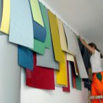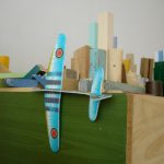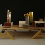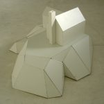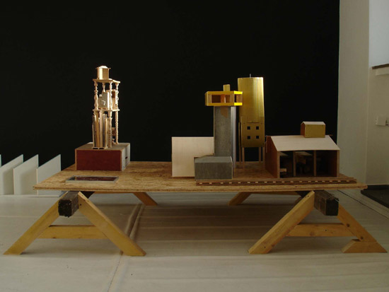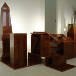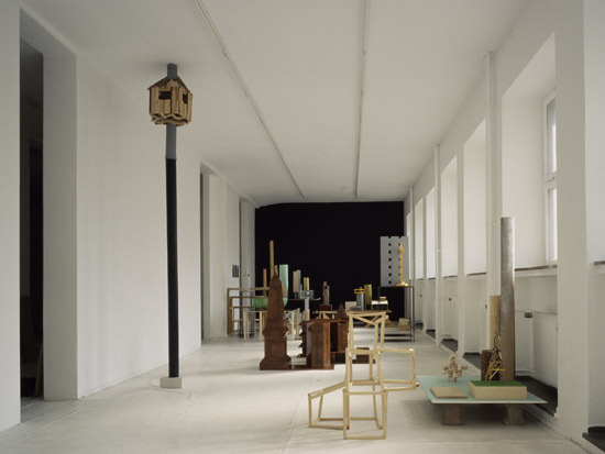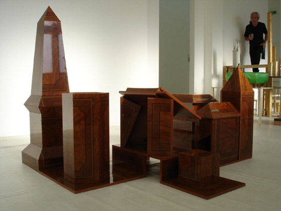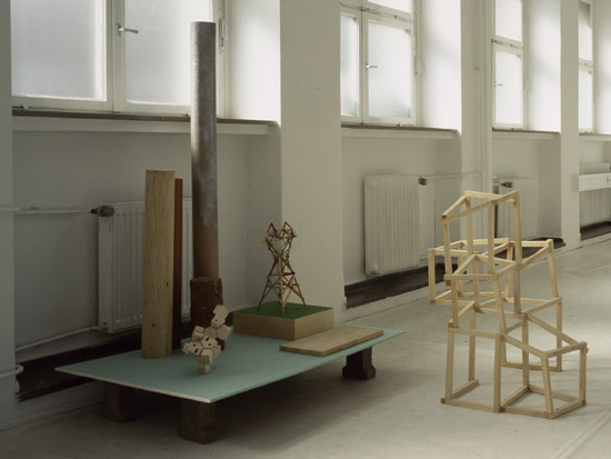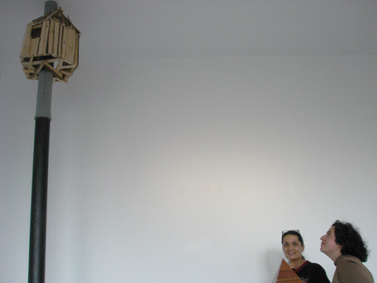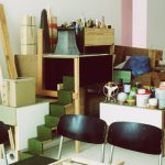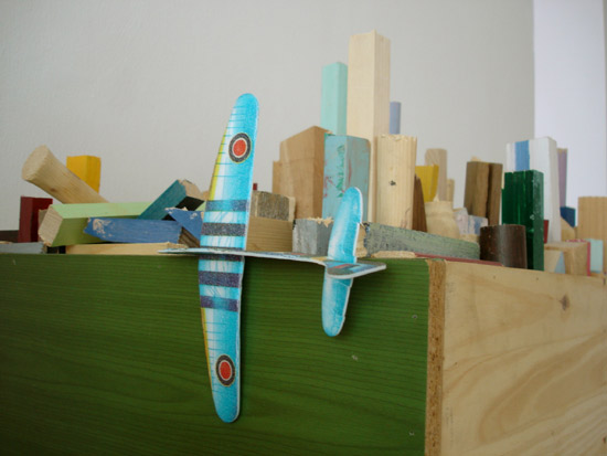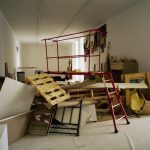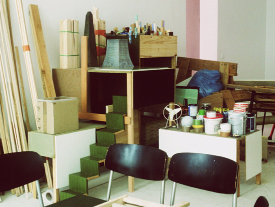 Wood, formica, plaster, cardboard, paint, screws and nails, plastic tube, diverse elements, lader,