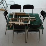 Bois, formica, vis, clous, tube en plastique, divers éléments, échelle,