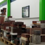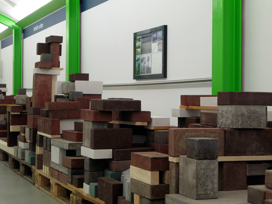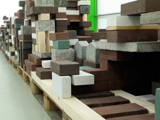 6 pavés pentagonaux, 12 briques creuses noires, 200 briques en béton cellulaire, 4 plots rouges,