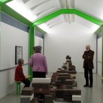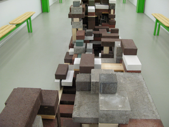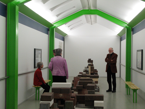 Vorfahrt achten est une invitation a observer une représentation futuriste de ces constructions à l’intérieur d’un décor qui, suivant la forme de la salle d’exposition, évoque clairement l’ arrêt de tramway face au kunstverein.