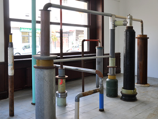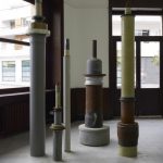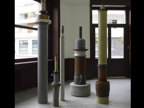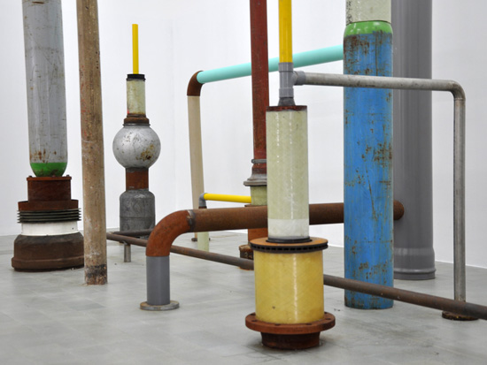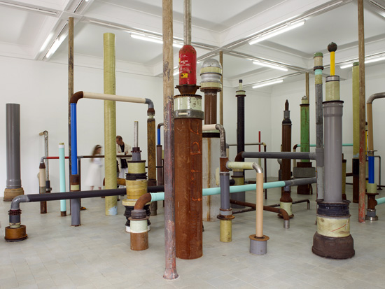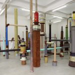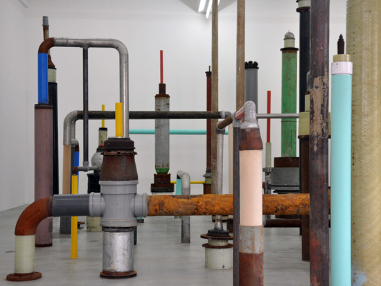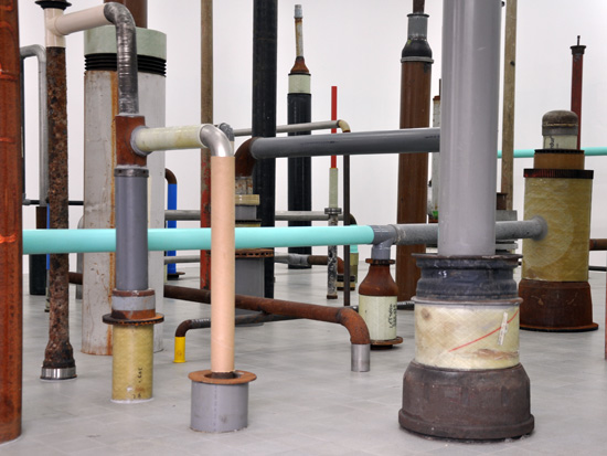 De ce désordre intuitivement ordonné, se détache ainsi une composition en volume, où se joue un véritable combat des contraires : aux lignes horizontales du réseau tubulaire répondent la verticalité de ‘sculptures totems’ autonomes. Ces empilements de sections de tuyaux scandent l’espace et semblent parfois se confondre voire se substituer aux piliers du bâtiment.