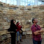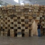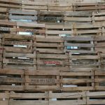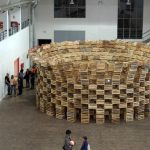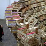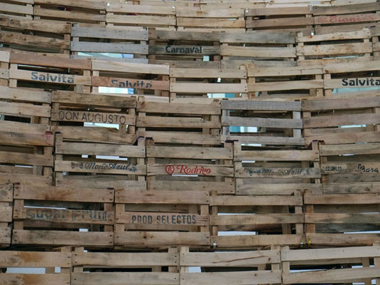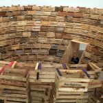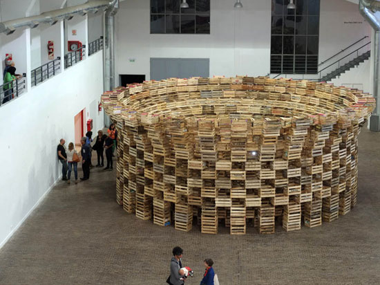 1500 cajones de verduras reciclados del mercado Central, tornillos. Altura 4 m / diametro 11 m.
