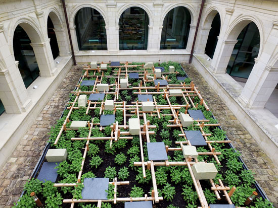 Stones blocks, slate, 500 carpenter’s pegs, 150 sage.
