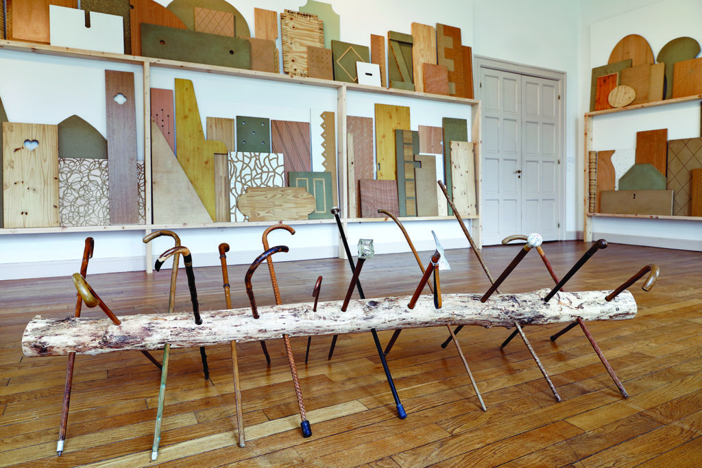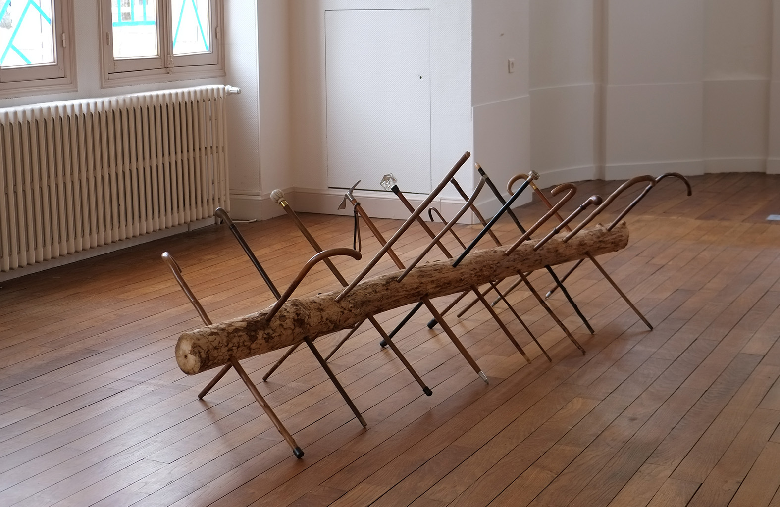 Un cheval de frise est une des barrières défensives les plus anciennes créées par l’homme afin de freiner la progression de l’ennemi. Constitué initialement d’un tronc central en bois sur lequel vient se greffer des piques repoussantes, cet élément récurrent des luttes armées à travers le monde se voit ici soustrait de toute velléité belliqueuse. Bien que reprenant la forme originelle du cheval de frise, la sculpture substitue aux lances agressives d’élégantes cannes en bois aux pommeaux ornés. L’artiste, par ce clin d’œil surréaliste, désamorce les conflits, arrondit les angles, force l’imagination. Placée en intérieur, l’œuvre accepte volontiers de troquer son inutilité protectrice contre une utopie esthétique. La sculpture semble dès lors abandonner sa passivité pour une marche à venir, prenant des allures de métamorphose zoomorphe en cours.