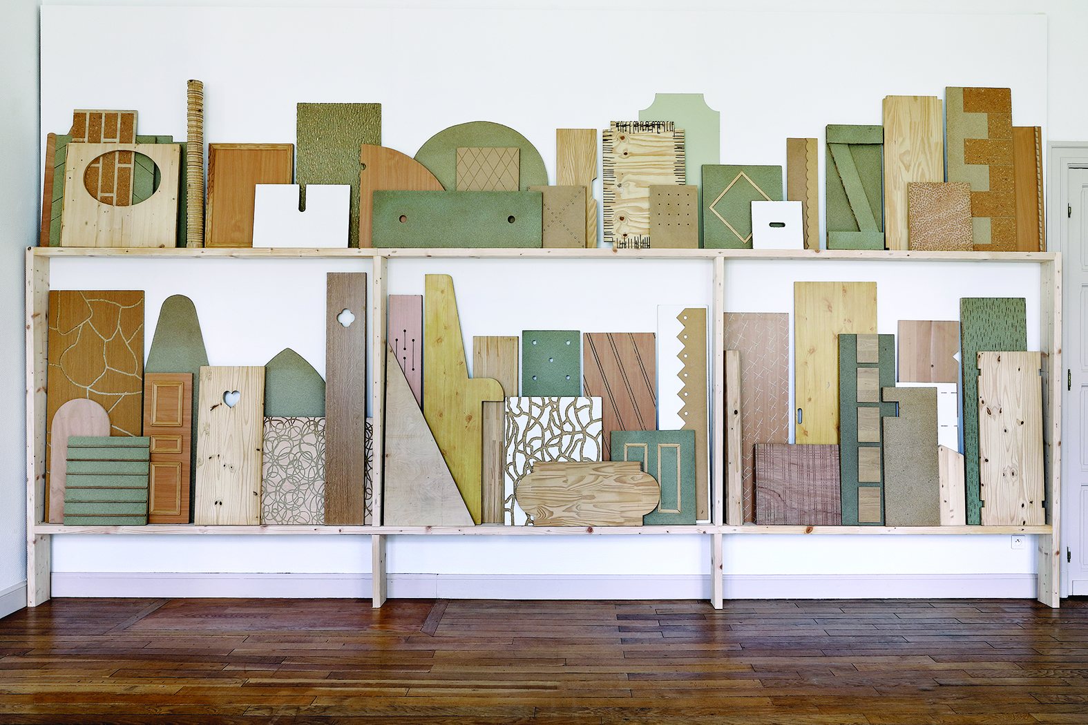 Cette étonnante « bibliothèque » est constituée de planches de bois de différentes essences, couleurs ou formes – des chutes, des rebuts -, dont chacune est marquée d’un motif particulier, directement inspiré par l’observation de l’artiste des ornements architecturaux ou décoratifs environnants. Tous ces éléments superflus (ceux que l’architecte Adolf Loos désirait voir disparaître à jamais) sont ici catalogués, rangés, accumulés, créant une mémoire formelle de ce décor qui nous entoure quotidiennement et que nous ne remarquons plus. Si l’adjectif possessif « ma » rend explicite la dimension subjective du choix, le terme de bibliothèque ne dissimule pas la volonté première de l’artiste : partager, éduquer, accompagner le visiteur dans un apprentissage de connaissances visuelles, afin de le rendre soudain attentif à la beauté du monde, construit par l’homme, jusque dans ses plus infimes détails.