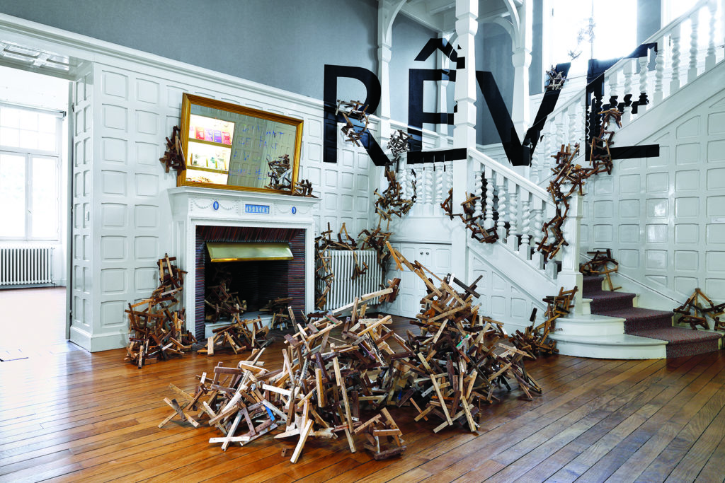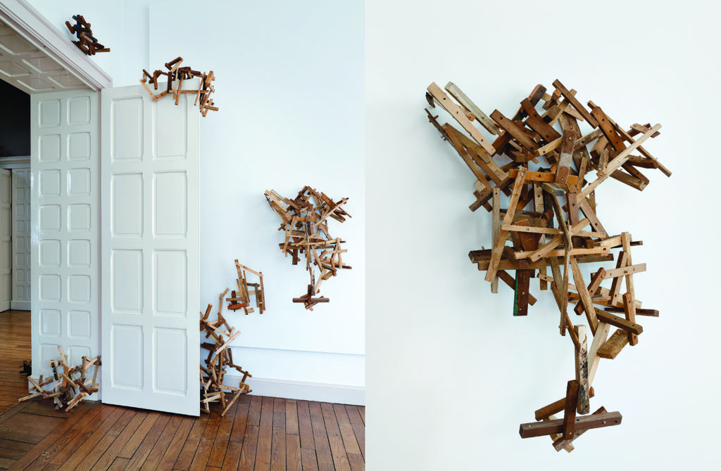 « N’auriez-vous pas des allumettes ? » nous interroge l’artiste d’un ton facétieusement provocateur. L’installation d’envergure est composée de centaines de petites sections de bois d’allumage, n’attendant donc qu’une étincelle pour prendre feu et rabattre les cartes. Grouillantes, envahissantes, s’immisçant dans les coins les plus reculés ou inaccessibles, les constructions semblent s’animer comme d’étranges animaux mus par un hypothétique instinct incendiaire. Derrière la pensée jubilatoire de pouvoir tout brûler, et tout recommencer, se cachent les mythes de purification par le feu, les flammes ardentes de la création, le grand incendie rituel qui annonce des jours meilleurs. De nouveau, Séverine Hubard s’empare de matériaux simples, basiques, pour créer des œuvres débordant l’imaginaire, qui se tiennent sur un fil tendu, un entre-deux, en attente ici du Grand Soir.