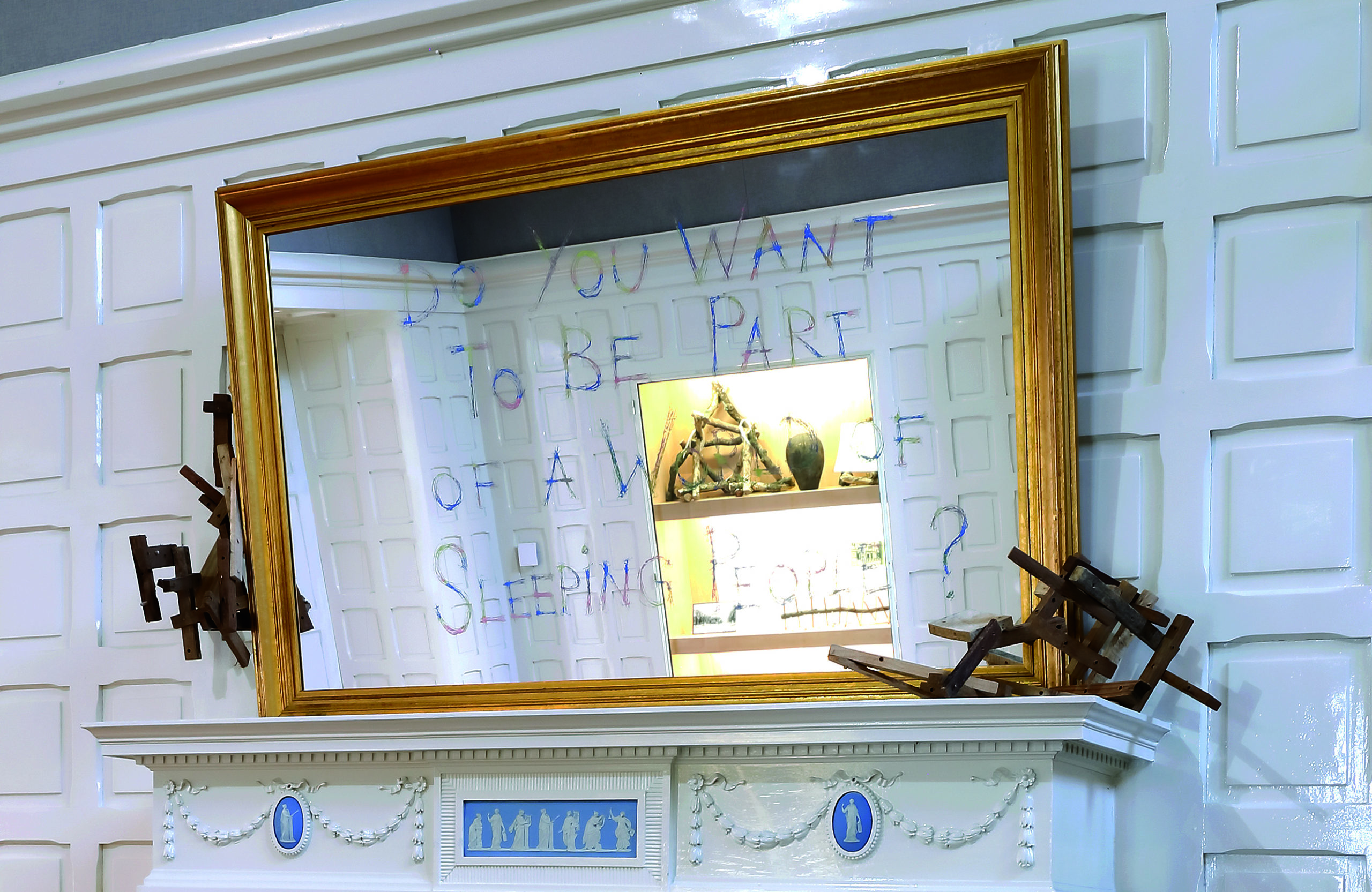 La citation, que nous pourrions traduire par « Est-ce que vous voulez faire partie d’un monde de gens endormis ? » est extraite d’un texte de l’artiste, musicien.ne et écrivain.e Genesis Breyer P-Orridge. La figure iconique de la musique industrielle et chef.fe de file du mouvement « pandrogyne » exhortait alors le lecteur à réagir, à ne pas se laisser passivement dominer par toute forme d’autorité, qu’elle soit politique, religieuse, sociétale ou qu’elle prenne la forme lénifiante d’une vie monotone. En inscrivant cette phrase sur un miroir – tel un cri gravé, ou une empreinte se révélant magiquement à la surface -, Séverine Hubard nous repose la question en nous mettant frontalement face à nous-mêmes. L’art doit nous questionner, nous déranger dans nos certitudes et habitudes, nous amener à réfléchir au sens de la vie. Il devient le reflet de la volonté de l’artiste, partagée dans nombre de ses œuvres, de se faire acteur social, de réveiller les consciences assoupies.
