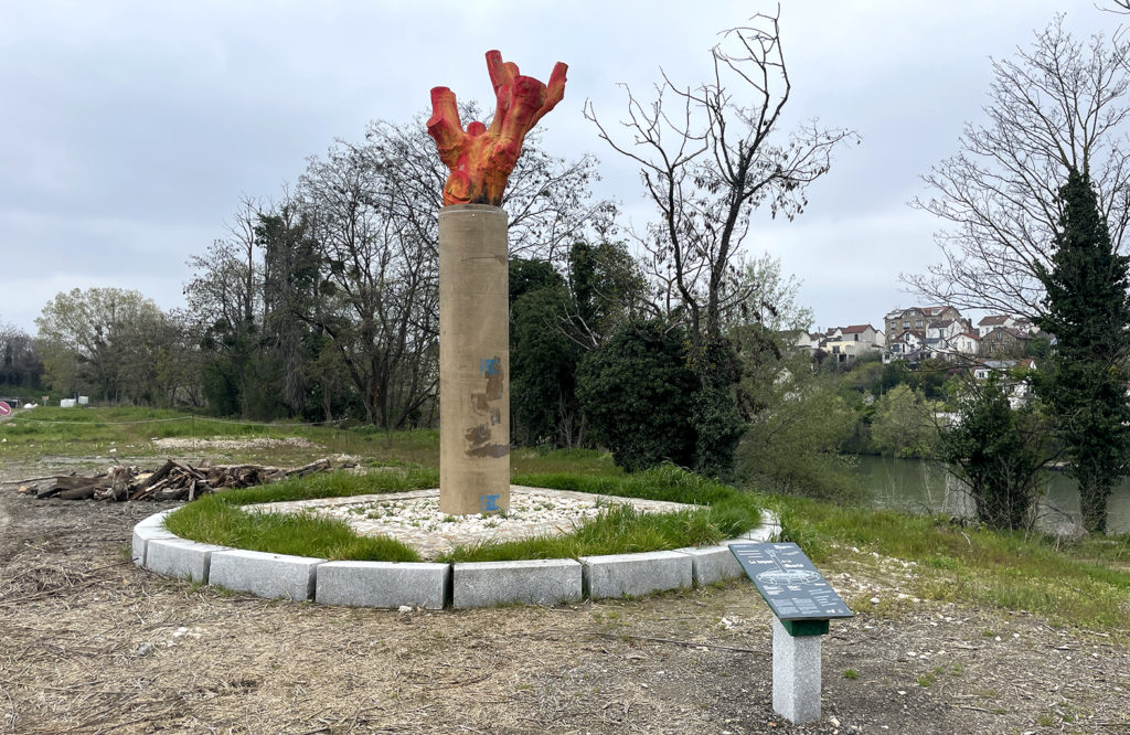 Matériaux trouvés sur le site (principe du concours) : Tuyau en résine, bois (couronne d’un platane), pavés, cailloux et 21 blocs de granit + peinture à l’eau, sable, chaux, ciment.