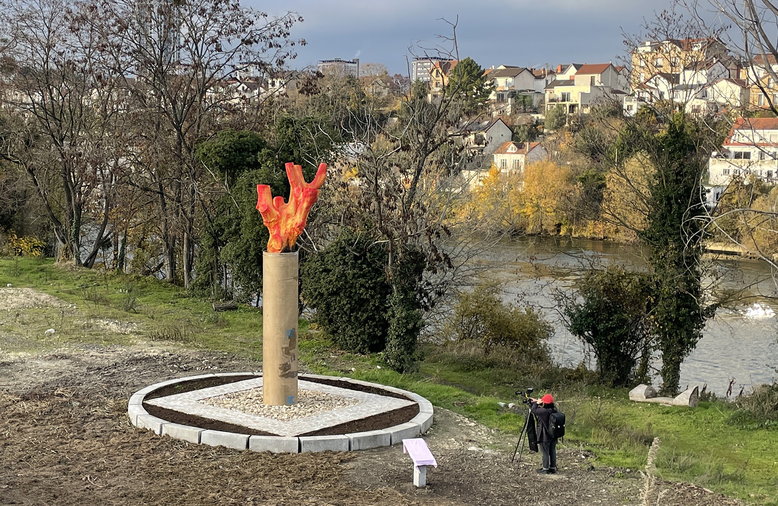 Marqueur loufoque d’une flamme éternelle éclairant une zone qui rassemble les visions pour un avenir plus vertueux. Cette flamme sur l’île joue de symboles et invite le spectateur à toutes les rêveries et les réflexions, convoquant entre autres et tout aussi bien les enjeux pour parvenir à un monde plus durable que l’idée de surpassement de soi et de réussite. La pauvreté des moyens utilisés ne rend que plus fort cette puissance évocatrice.