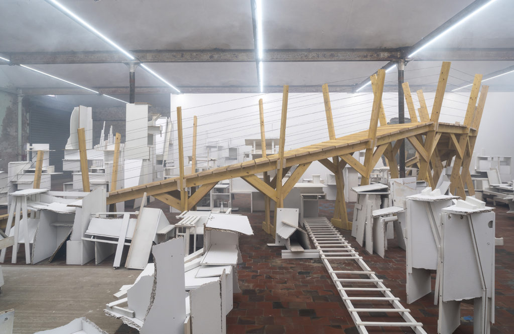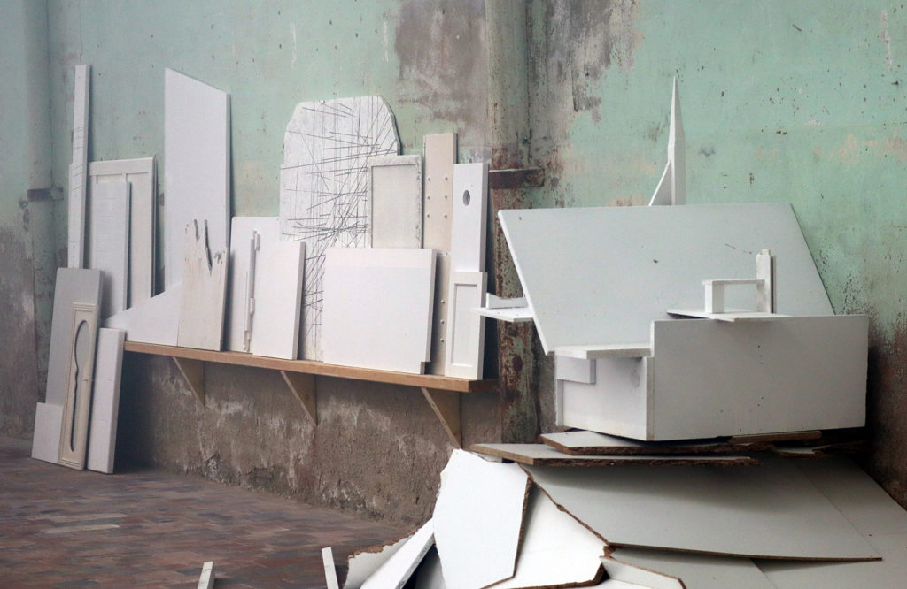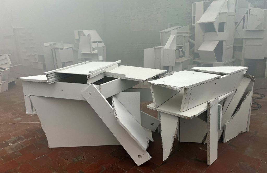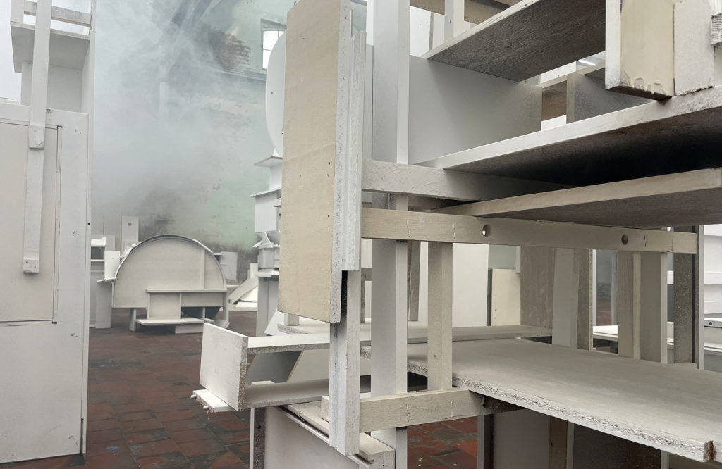 Une cinquantaine de constructions en bois de récupération scié ou/et cassé et cloué, peintes en blanc