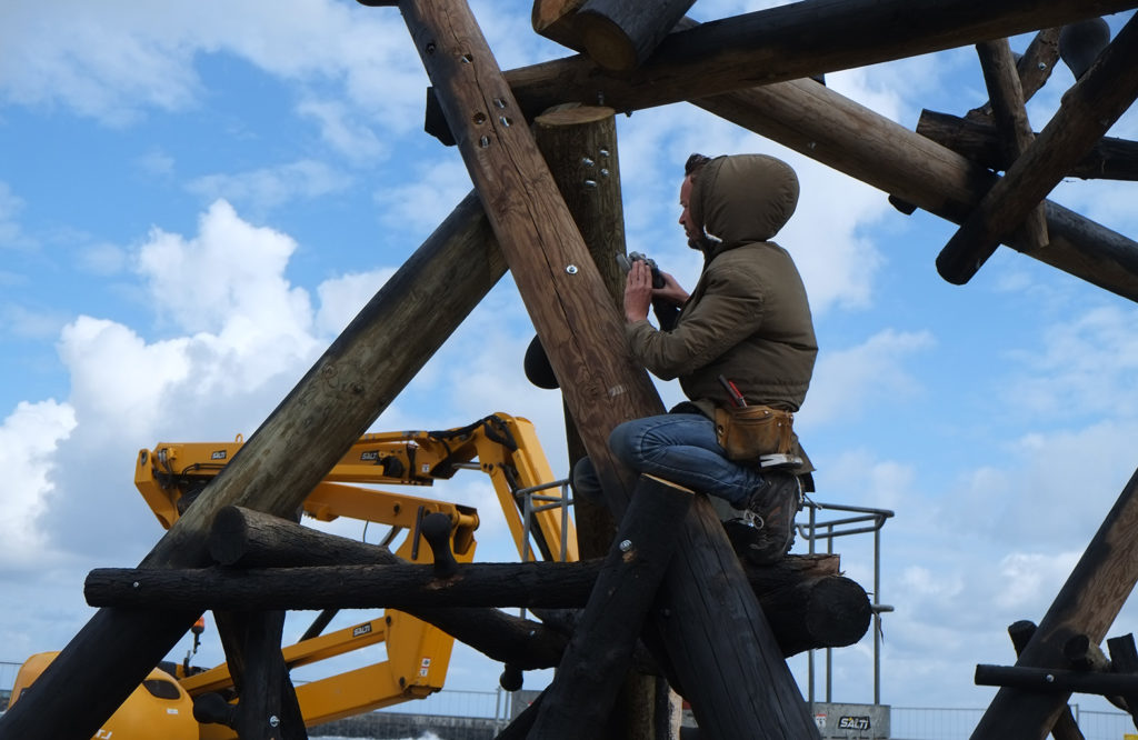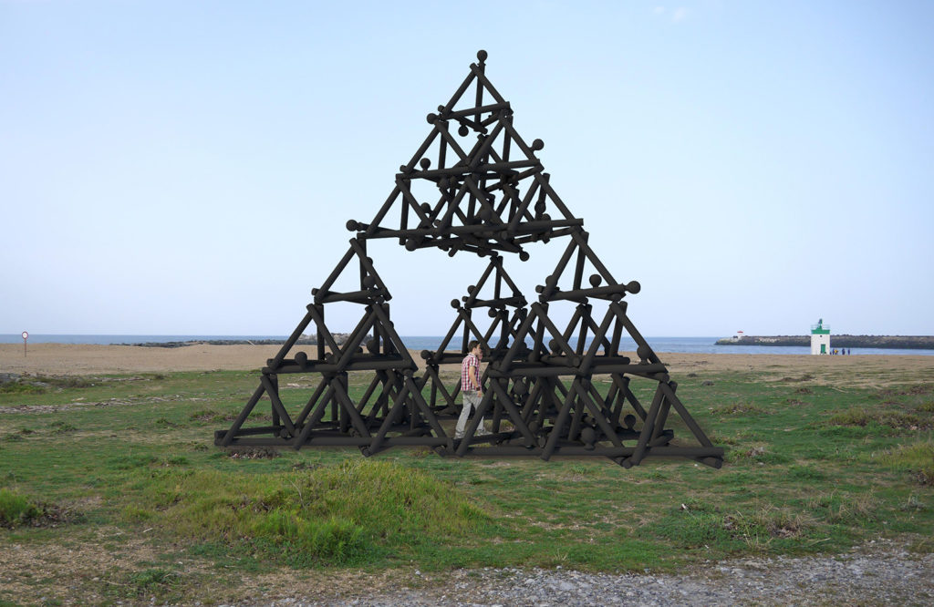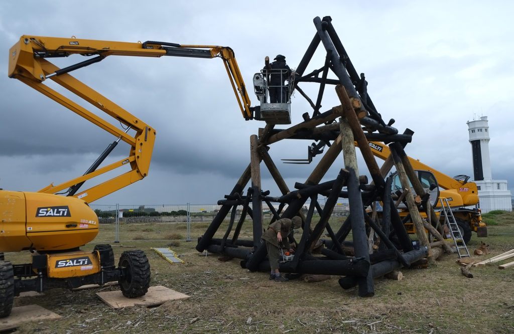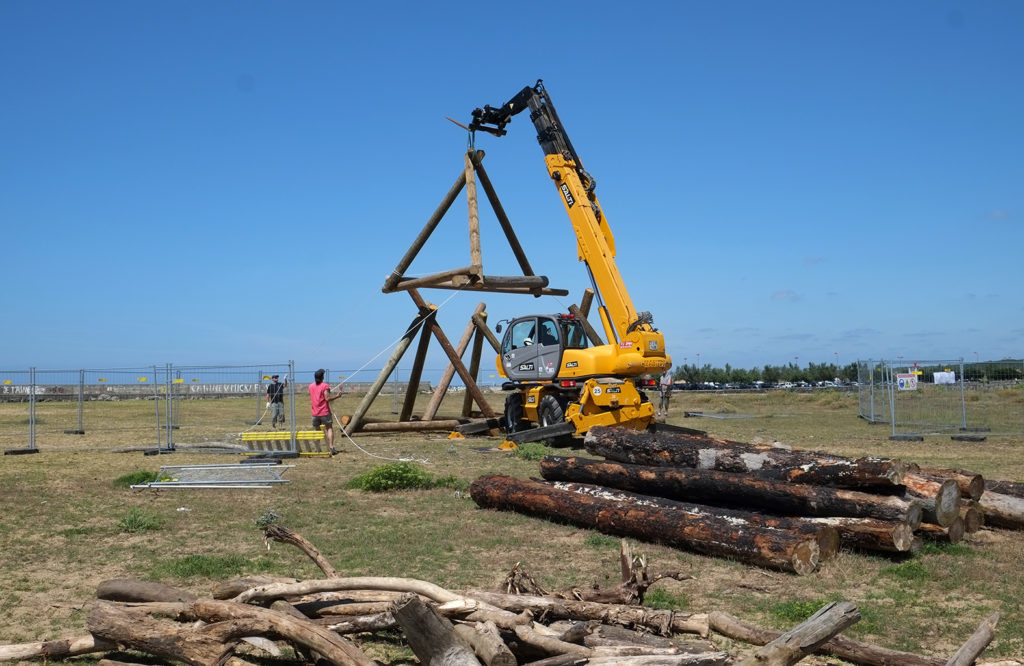 Anglet le 12 juillet 2021 La Littorale , Biennale d’art contemporain / L’artiste Séverine Hubard en plein montage de sa sculpture monumentale sur le site de La Barre : une pyramide – cabane en bois faite avec les pins brûlés dans l’incendie de la forêt de Chiberta en 2020 et étrangement greffée de têtes en bois / Oeuvre intitulée Portrait de famille