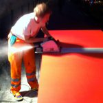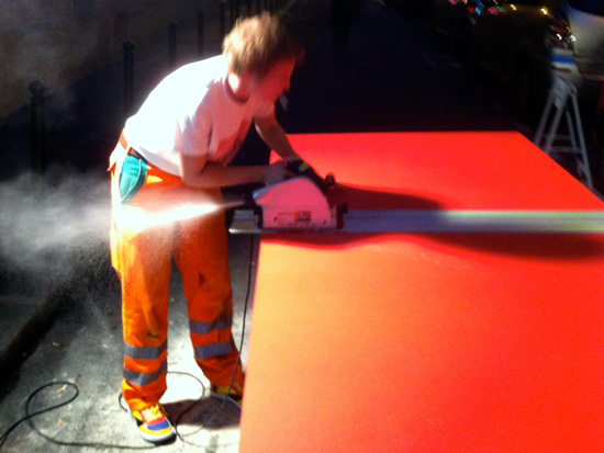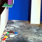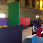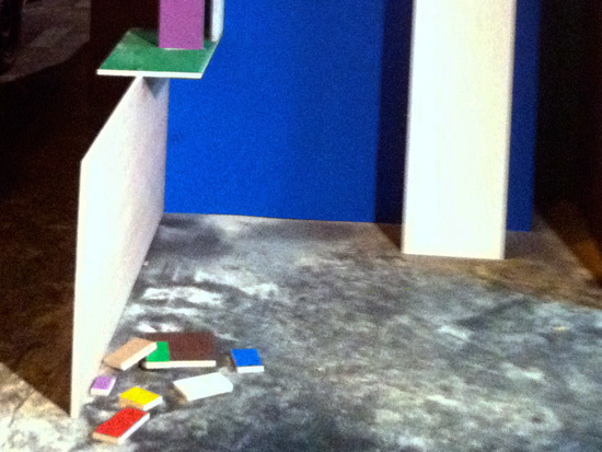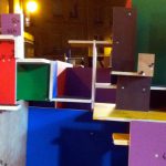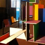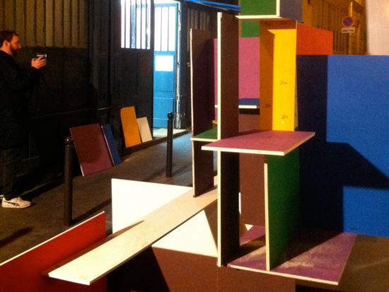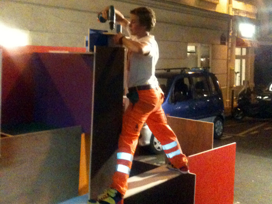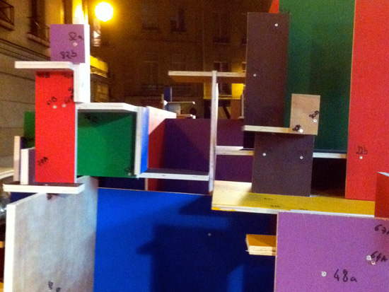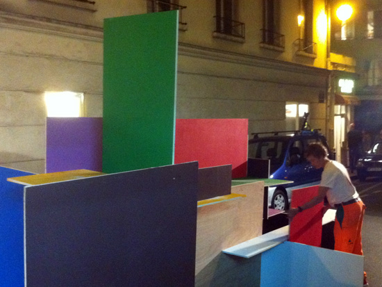 Je travaille seule à partir de 10 planches identiques peintes chacune d’une couleur différente / I work alone with 10 wood plank same size painted in diférent color.