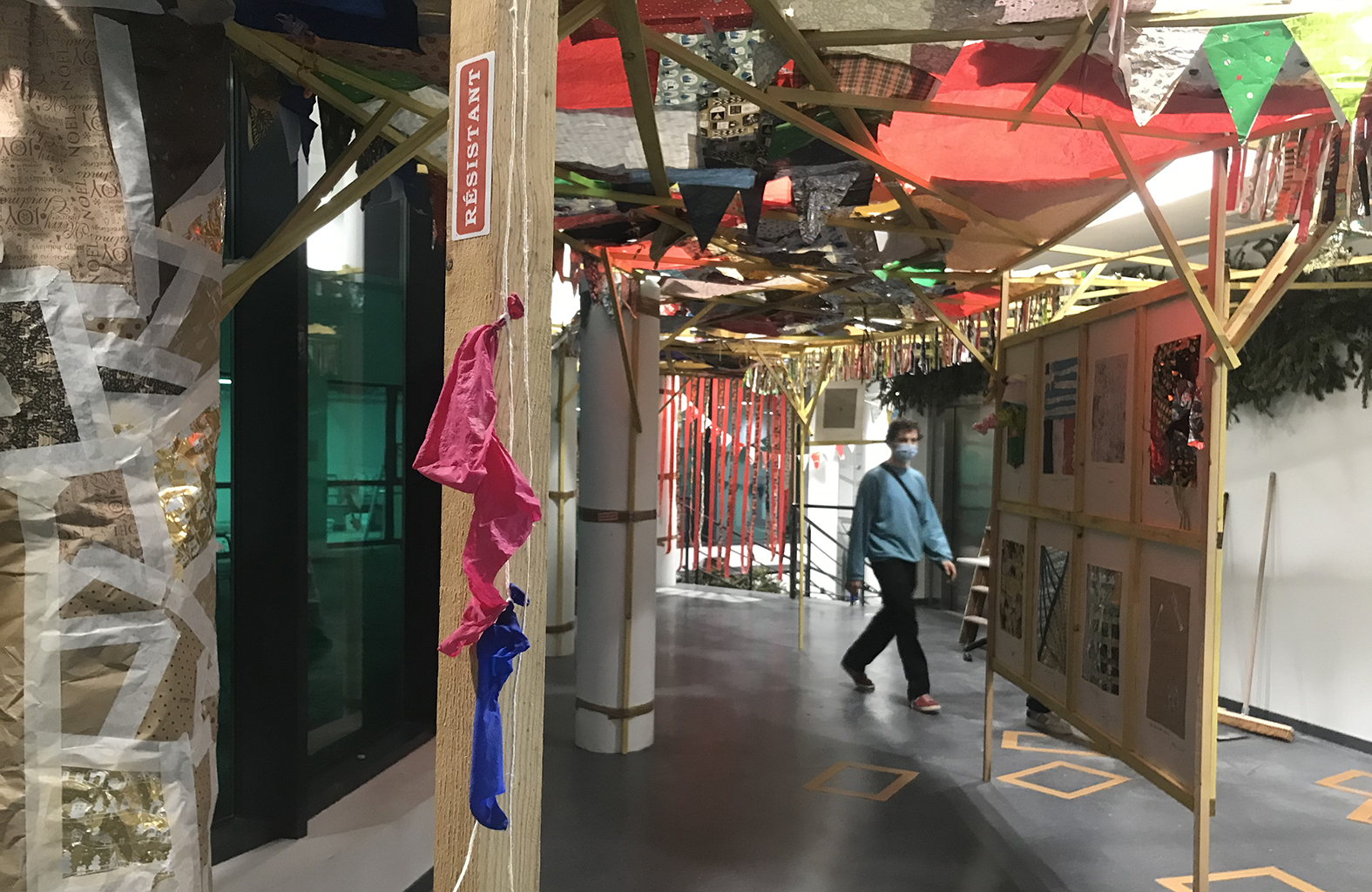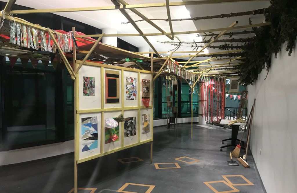 Une scénographie dans le passage avec les restes des fêtes de d’année.