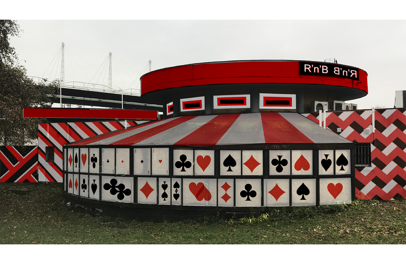 En tant qu’artiste je reconnais que la fermeture des lieux à créer d’autres collages, de parpaings, de planches les unes sur les autres. Mais le tout est clairement délaissé́, non entretenu et c’est finalement l’état désœuvré́ de ce lieu qui m’a inspiré́ et donné envie de le rendre vivant. Je propose la reconversion de ce complexe en un tableau éphémère le temps de sa réinsertion ou destruction ? Le lieu me sert de support comme une toile géante en trois Dimensions.