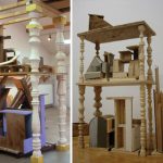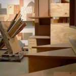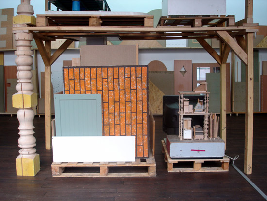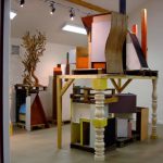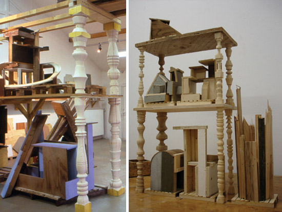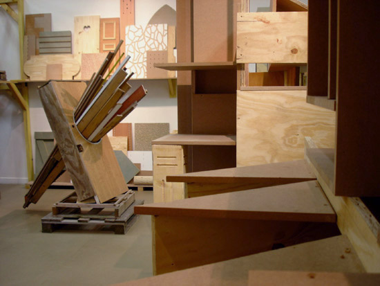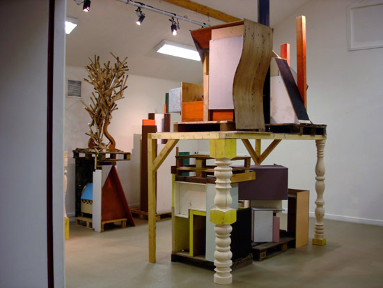– des constructions/sculptures sur palettes rangées dans des étagères
