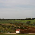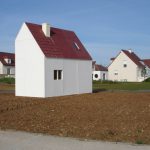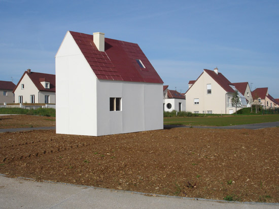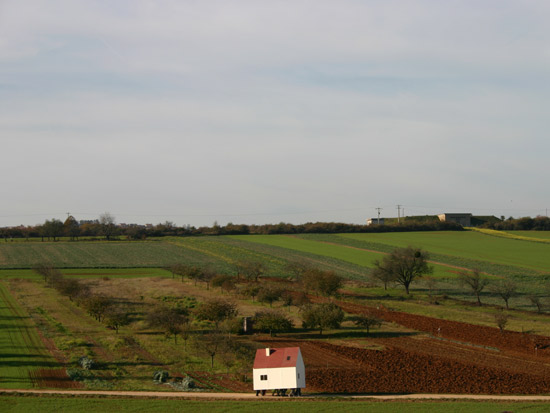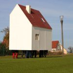 Description : une maison prend la fuite et déambule à pied dans le paysage.