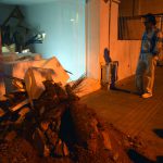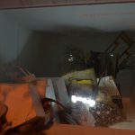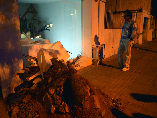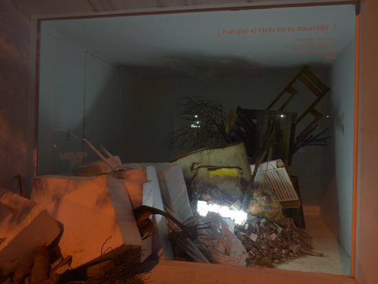 Durante el montaje de la obra, una instalación que ocupa la vitrina y parte del andén (vereda), se intensificó nuestra relación con los vecinos, los obreros y los recicladores (*) de esta zona residencial del barrio Granada. Las propiedades de los materiales: escombros de casas antiguas derrumbadas para la edificación de una nueva arquitectura, arcillas rojas, amarillas y pardas, trozos de icopor (telgopor), restos orgánicos, pedazos de muebles, tubos de neón y una llanta, cobraron una dimensión sensible en la tensión por la disputa de la basura en el espacio público y su valorización como mercancía. Es así que tomamos consciencia que, hasta su desmontaje, nuestra obra estará en un estado permanente cambio, movimiento y creación, dado por la circulación que los habitantes seguirán haciendo de dichos materiales.