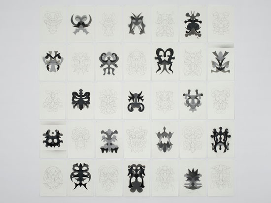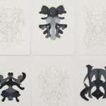 Deux ensembles de 17 pochoirs et 18 dessins au feutre. (total 150 x150 cm, chaque feuille 25x35cm) / Set of 17 stencils and 18 felt-pen drawing, (total 150x150cm, each sheet 25x35cm)