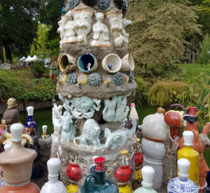 Collection of 50 bottle of alcool from China and from France, glazed ceramic, modelled astrological sign, porcelain women and figurine, cork and lime mortar.