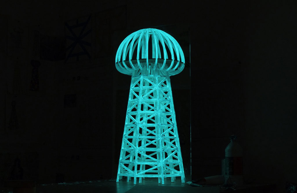 Bois de charpente, équerres métalliques, peinture blanche et photoluminescente.